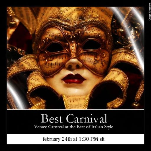 After the show a great BALL in CARNIVAL COSTUMES at the Stella d’ORO/ BESTAR CLUB in the center of the Best of Italian SIM!! 5,000 l$ Prize to the best costume. Dances, Freebies, Shopping. An event not to be missed!!!
